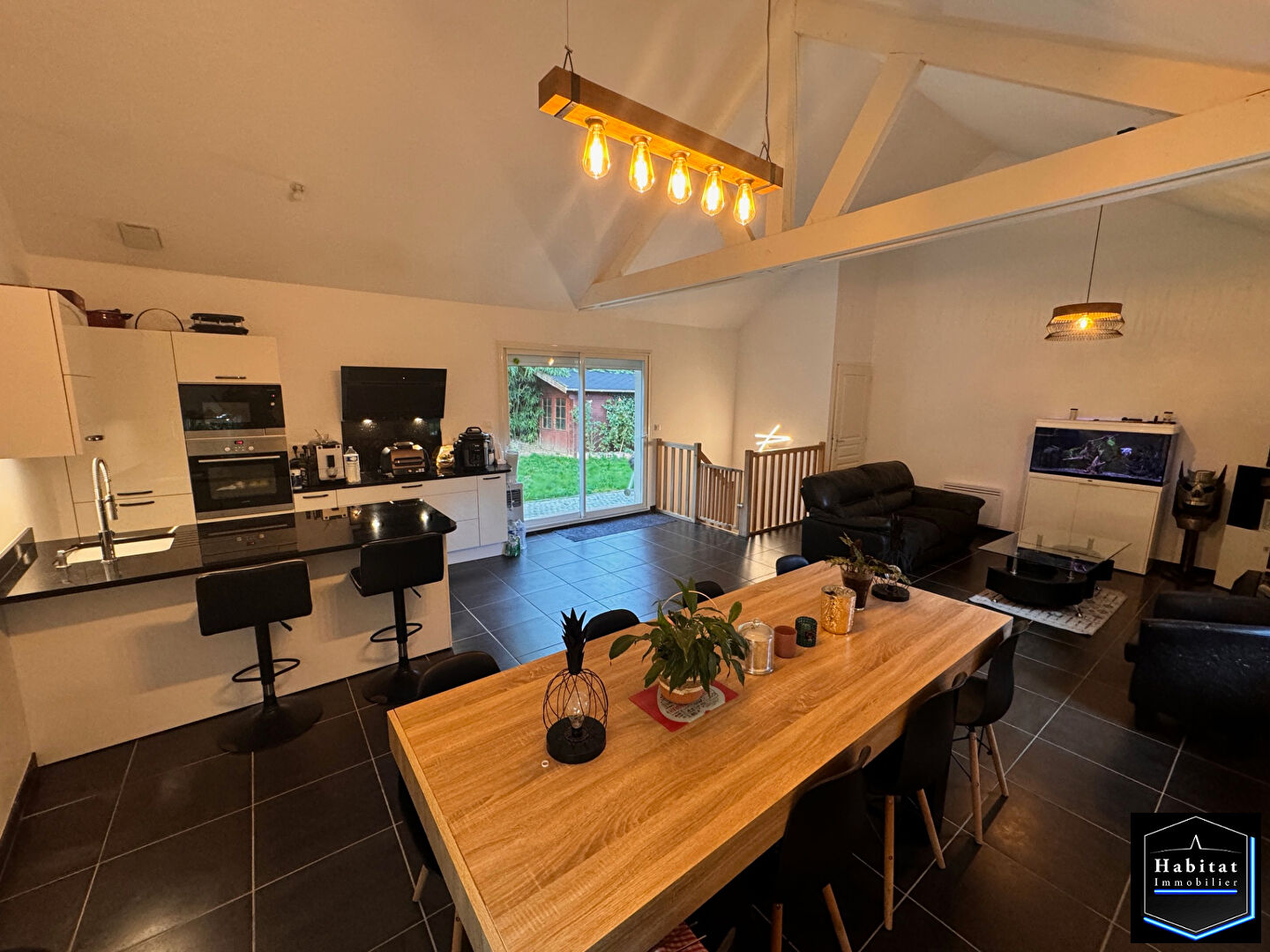 - Grande pièce de vie de 40 m² avec cuisine aménagée et équipée, coin salon et coin repas