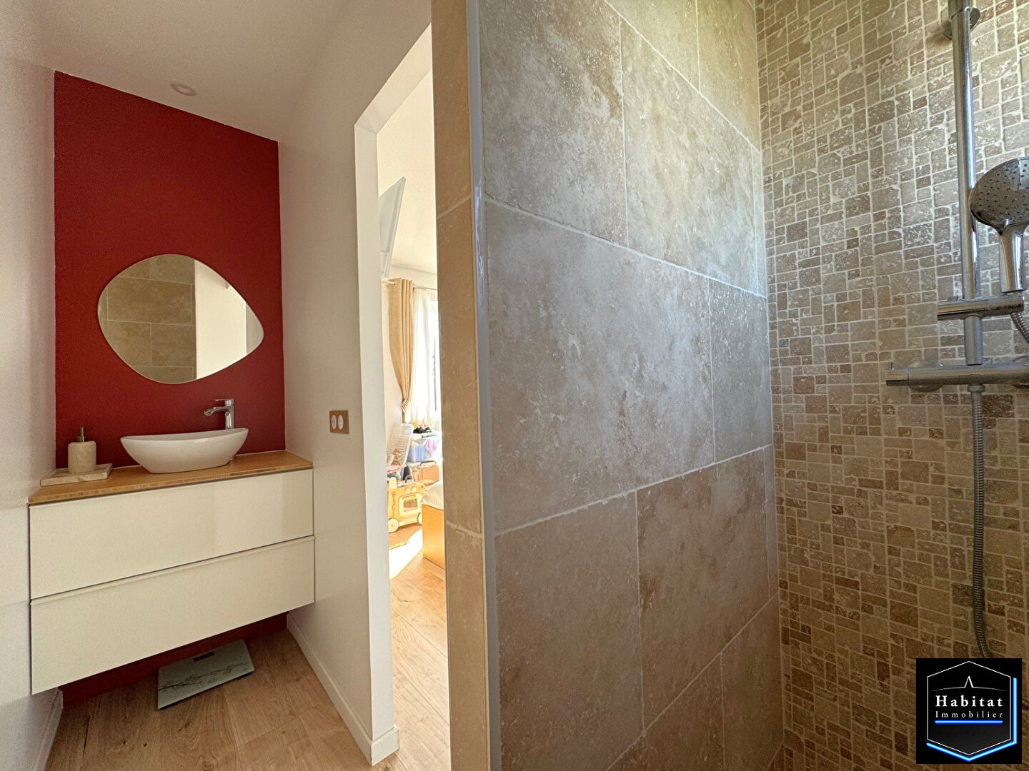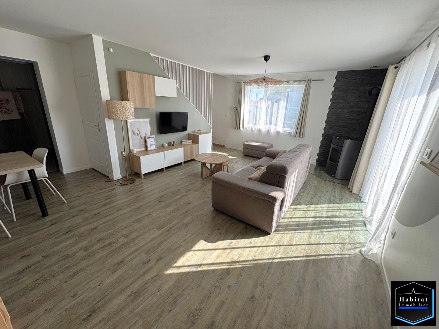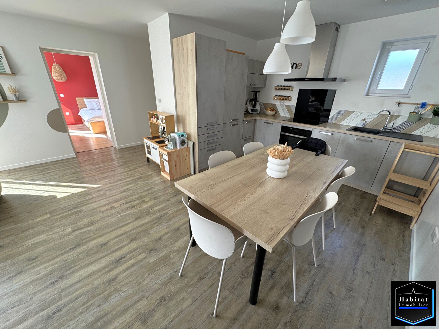 LEVIGNEN - Votre Réseau d'agence HABITAT IMMOBILIER vous propose, en EXCLUSIVITE dans un quartier calme, à proximité des écoles et de l'axe N2, ce beau pavillon indépendant de 2017 offrant, une entrée avec placard, une pièce de vie baignée de lumière avec cuisine ouverte équipée, une suite parentale avec salle d'eau et dressing, buanderie avec adoucisseur et rangements, wc séparé et un garage pour la moto. A l'étage : palier, 3 chambres et salle d'eau avec wc. L'ensemble sur un terrain de 500 m² avec une grande terrasse exposée SUD/OUEST, une large allée goudronnée pouvant accueillir 2 voitures. Chauffage : poêle à granulés + VMC double flux.