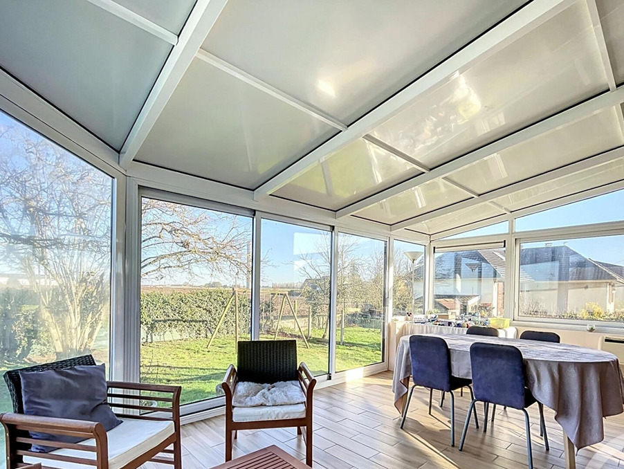 Au rez-de-chaussée : entrée sur un séjour lumineux, cuisine américaine équipée haut de gamme, véranda conviviale, deux chambres, salle d'eau et WC indépendant.
